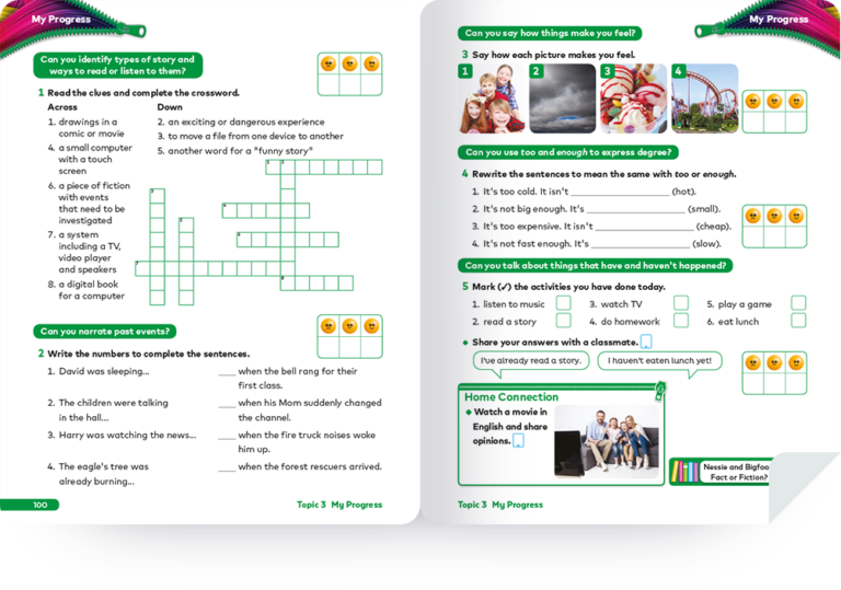 At the end of each topic, students self-evaluate with Can you…? questions and short tasks, helping them reflect on their progress. A Home Connection activity invites the whole family to get involved, by doing a project together at home. Detailed steps are on the digital platform in English and the students’ native language.