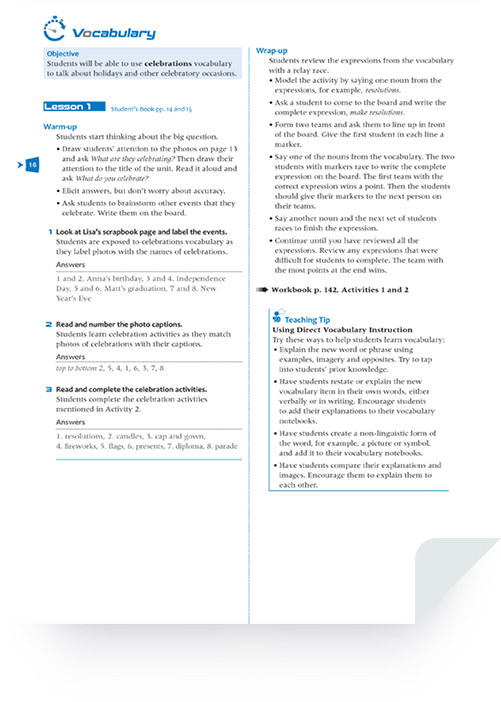Everything you need for successful lessons that meet your students’ needs: There are clear objectives at the start of each section, and a fun warm-up activity to review prior knowledge and prepare students for the lesson. Step-by-step instructions guide you through each activity, including answer keys and listening scripts. Wrap-up tasks practice and personalize newly-learned material at the end of the lesson, usually in the form of a game. An Extension activity in every lesson encourages students to use the language to communicate in real-life situations.